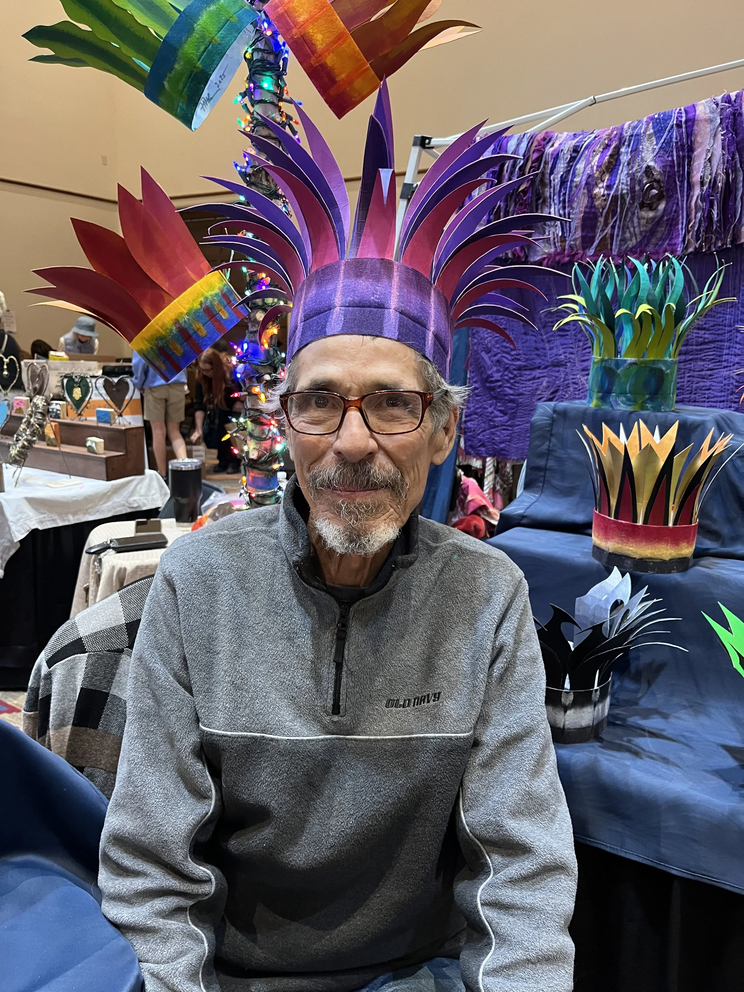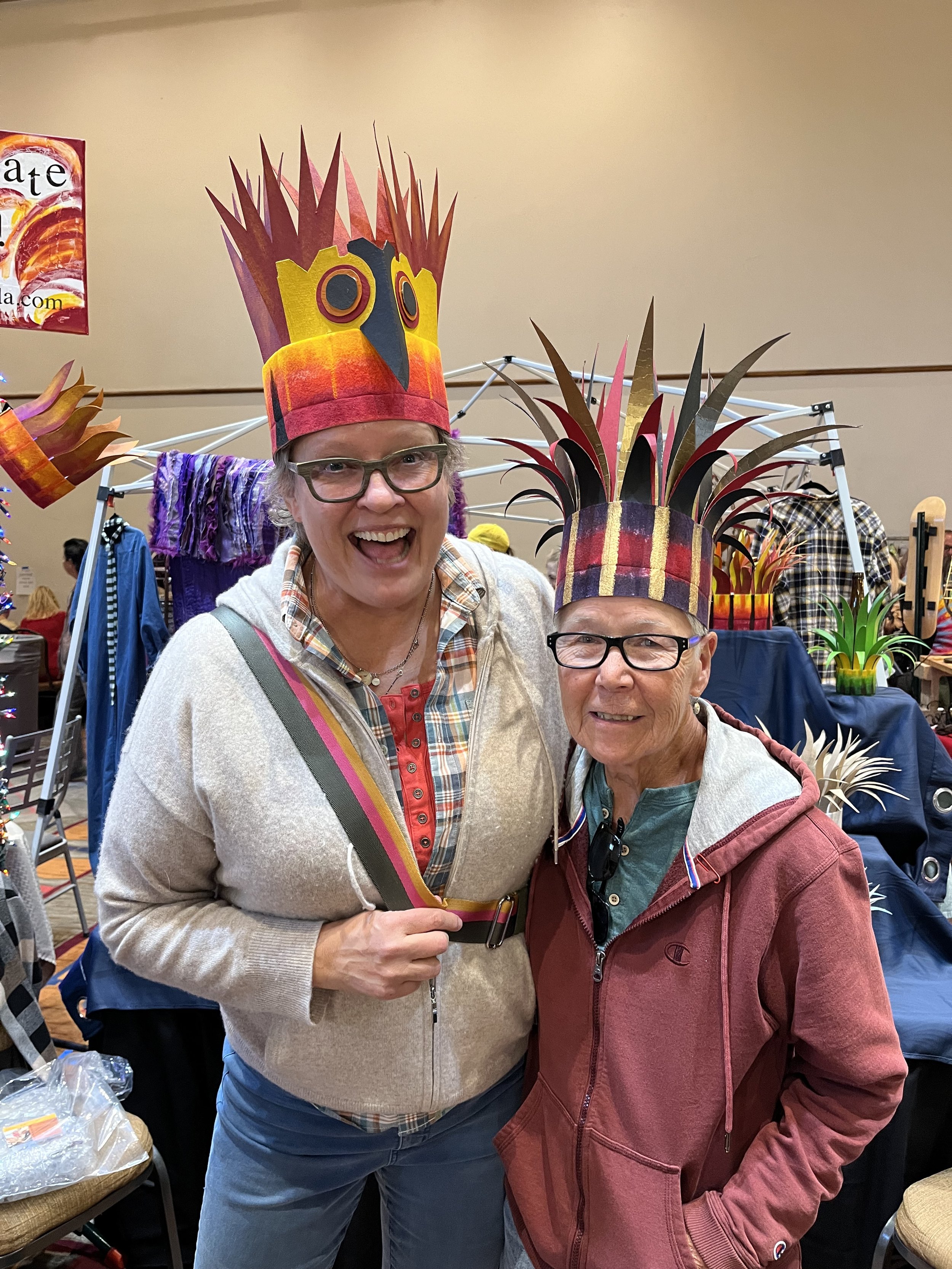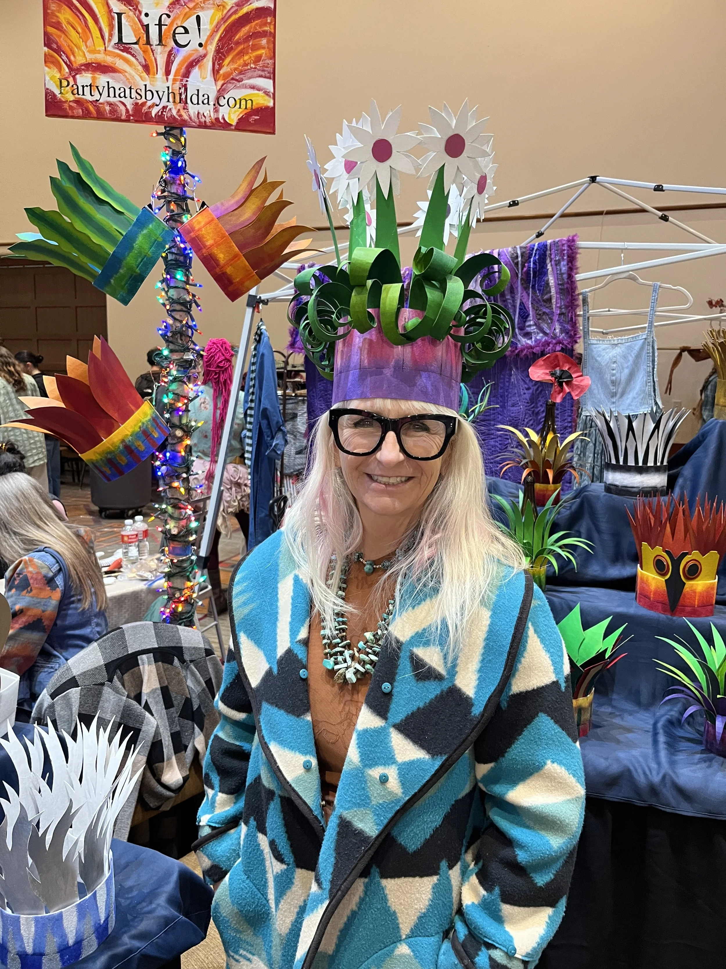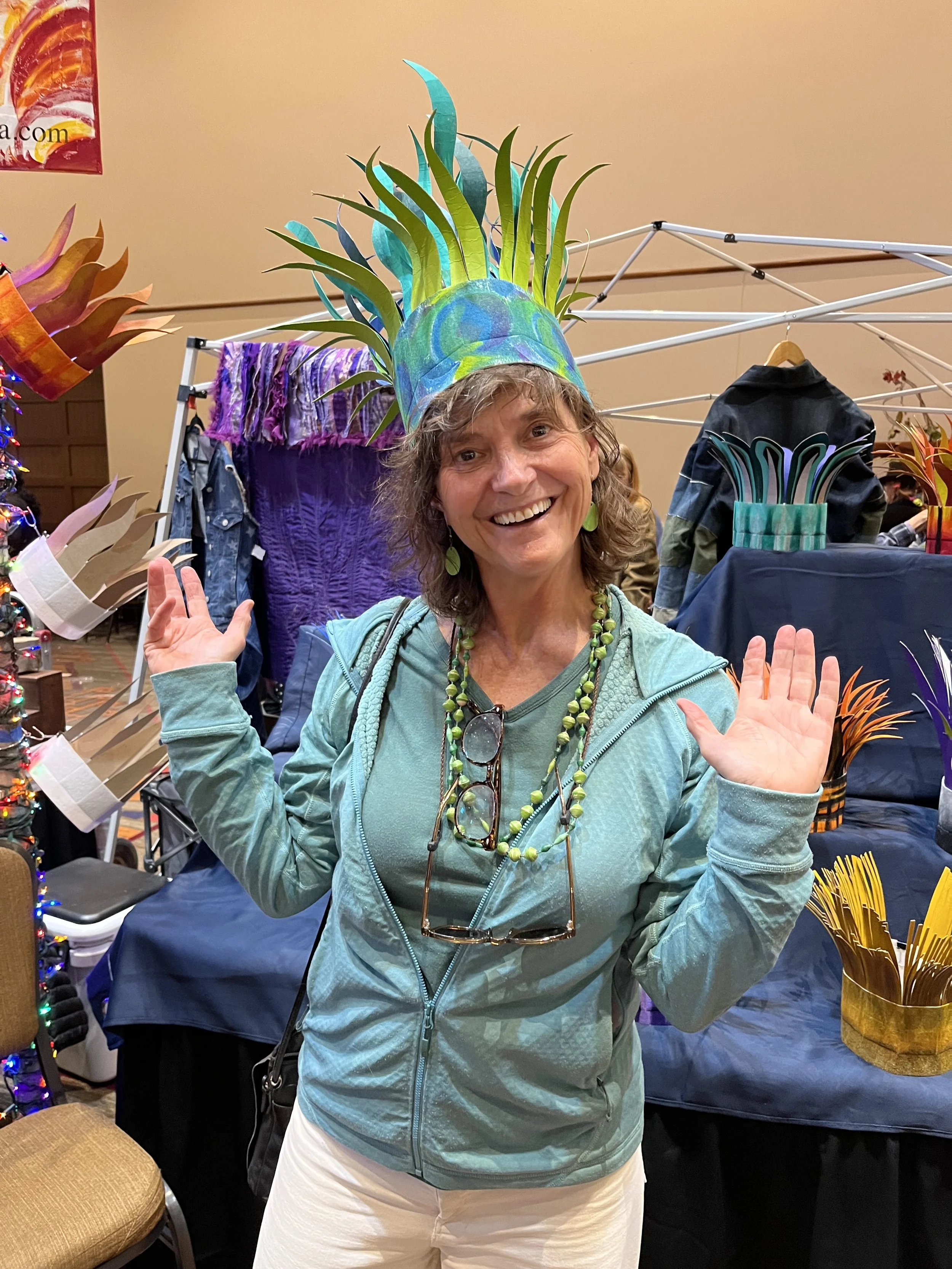 Hat bands are hand cut, sewn and painted on the outside. Hat attachments are also hand cut but painted on both sides. When all are dry, the attachments are inserted into the pockets that have been sewn onto the inside of the hat band. These attachments can then be removed and reversed for a totally different look!