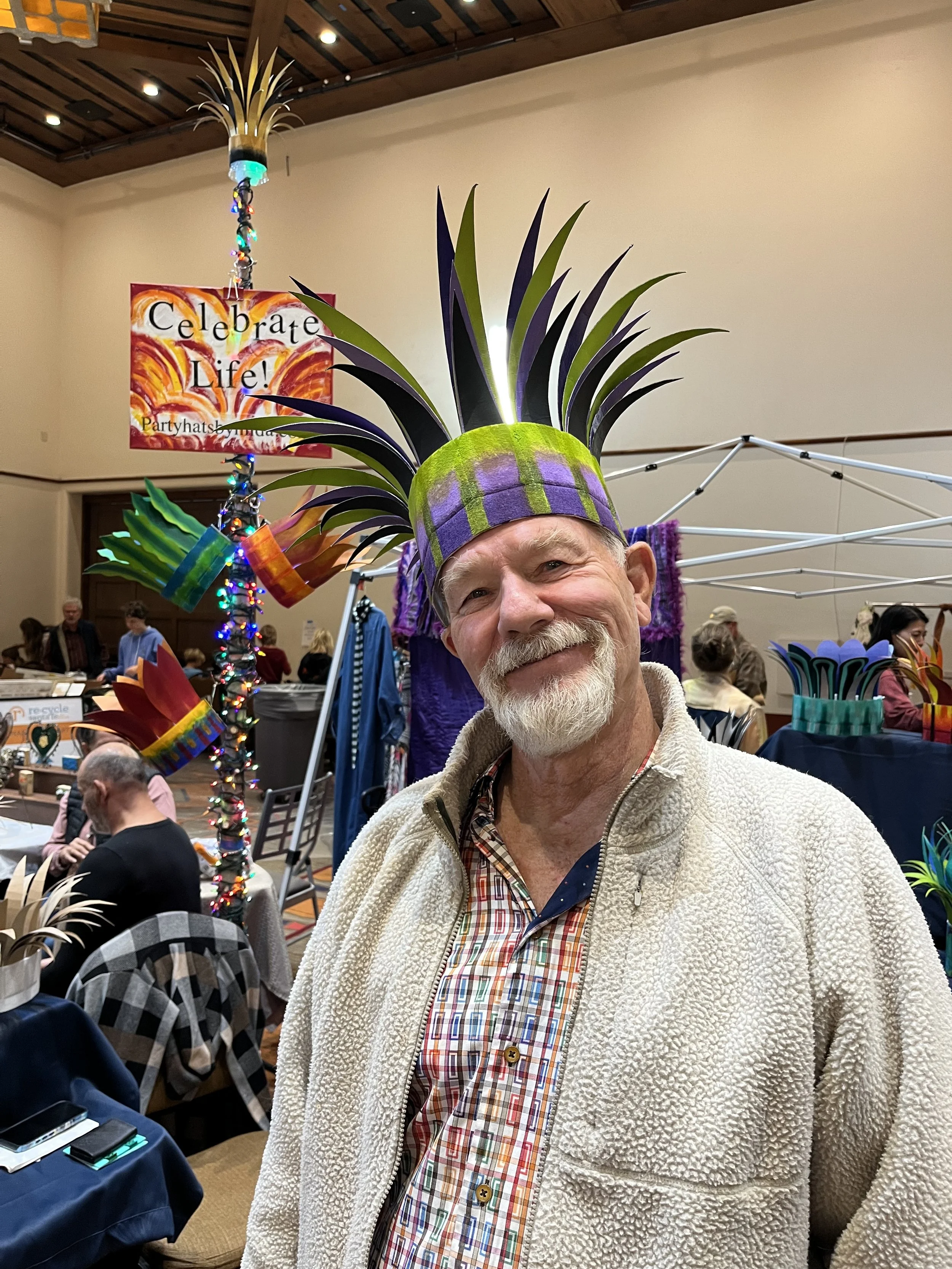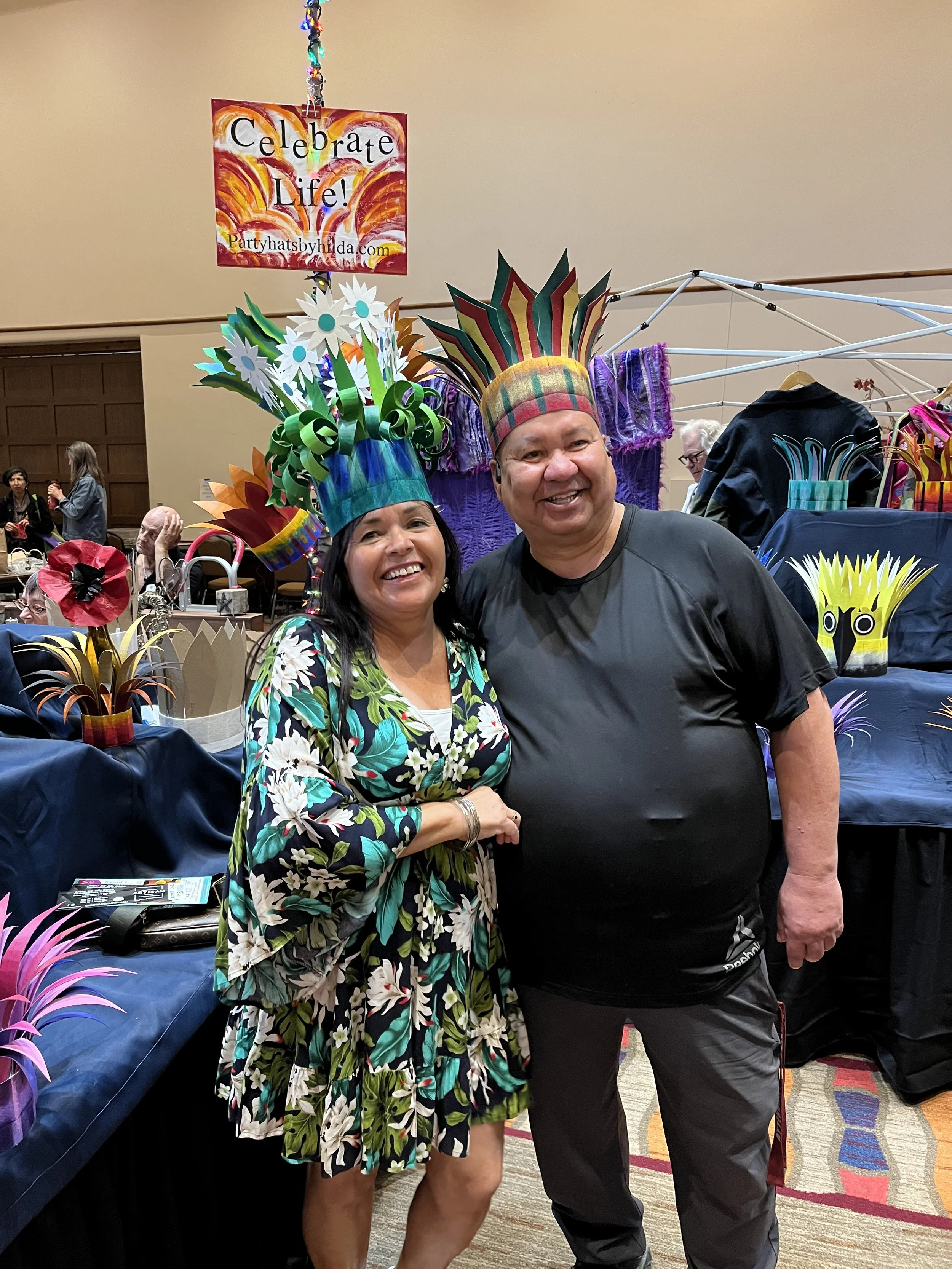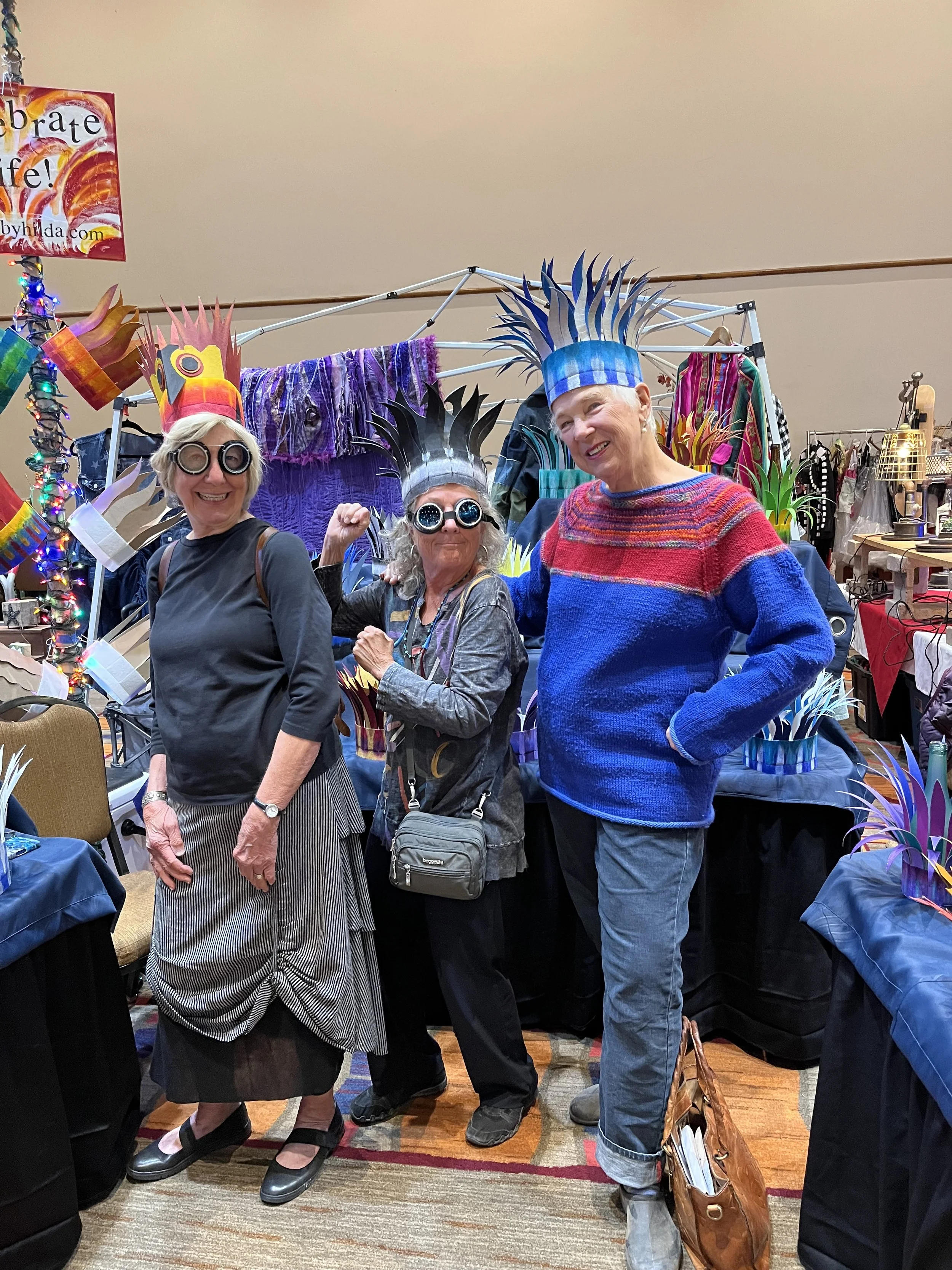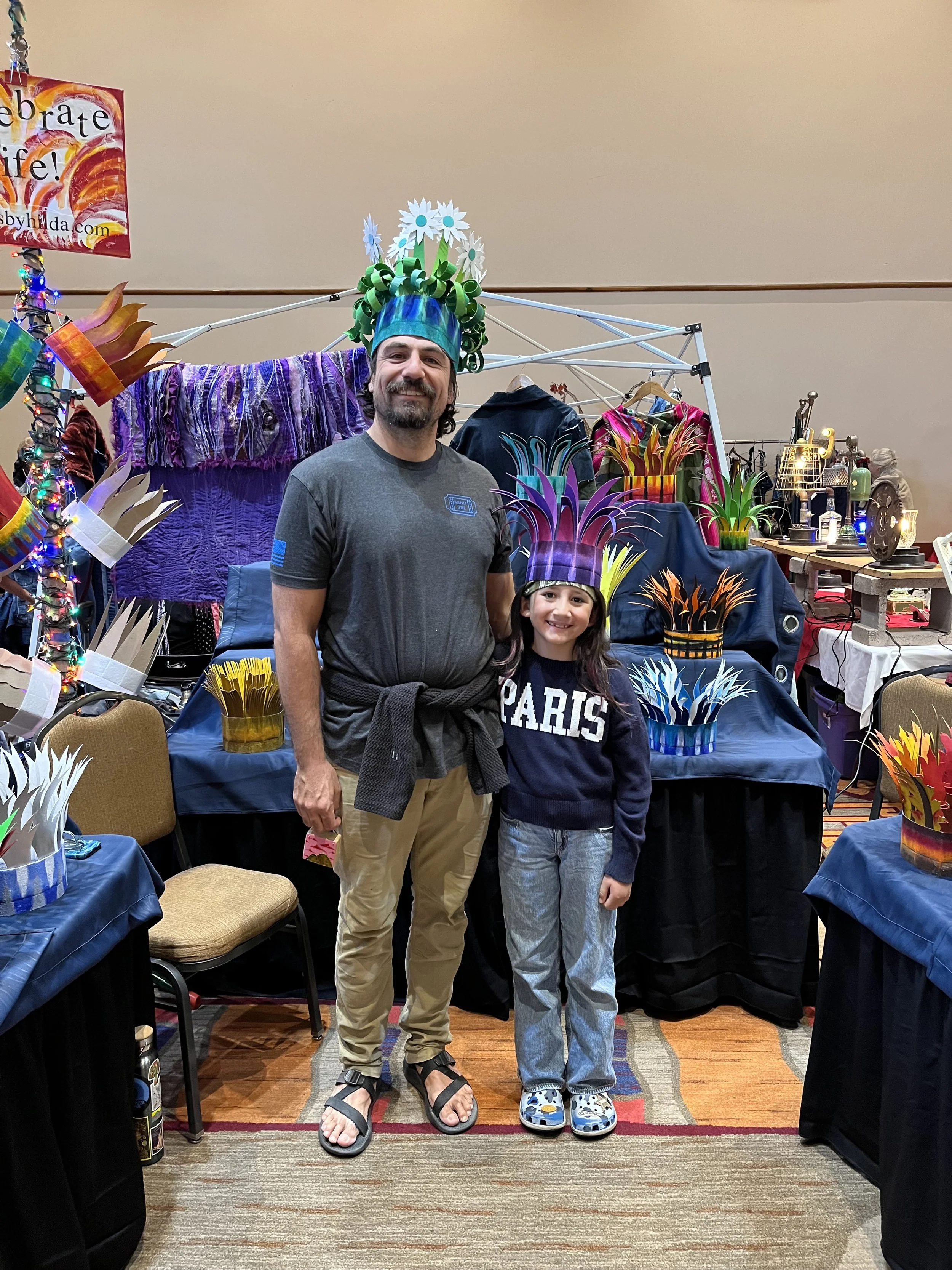 Hat bands are hand cut, sewn and painted on the outside. Hat attachments are also hand cut but painted on both sides. When all are dry, the attachments are inserted into the pockets that have been sewn onto the inside of the hat band. These attachments can then be removed and reversed for a totally different look!